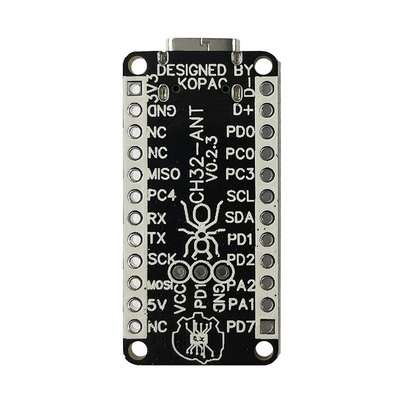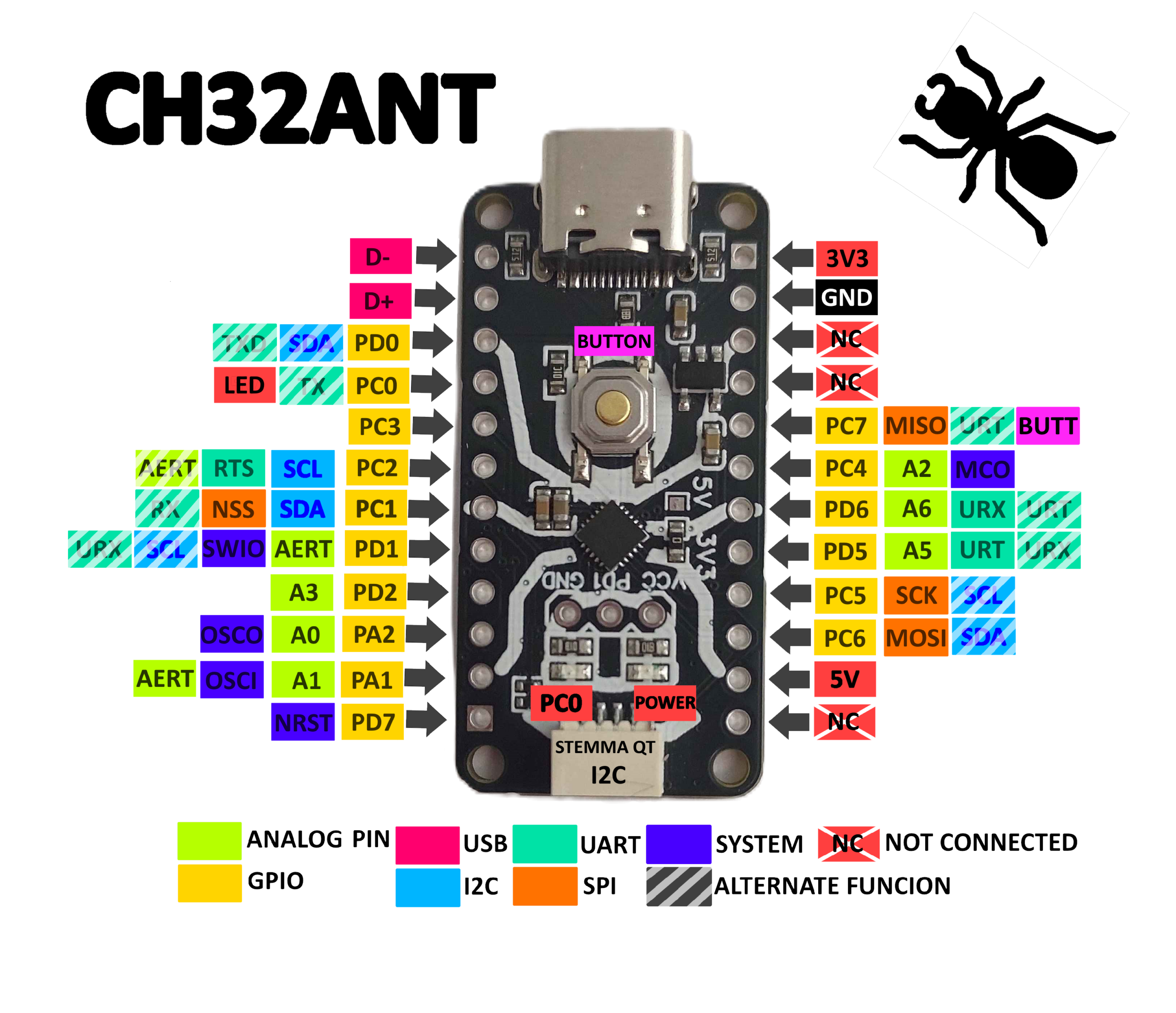 CH32 ANT je vývojová deska založená na mikrokontroléru CH32V003F4U6. Je to malá přátelská deska s kompatibilitou logického napětí 3v3 a 5v, I2C komunikací a USB C konektorem.