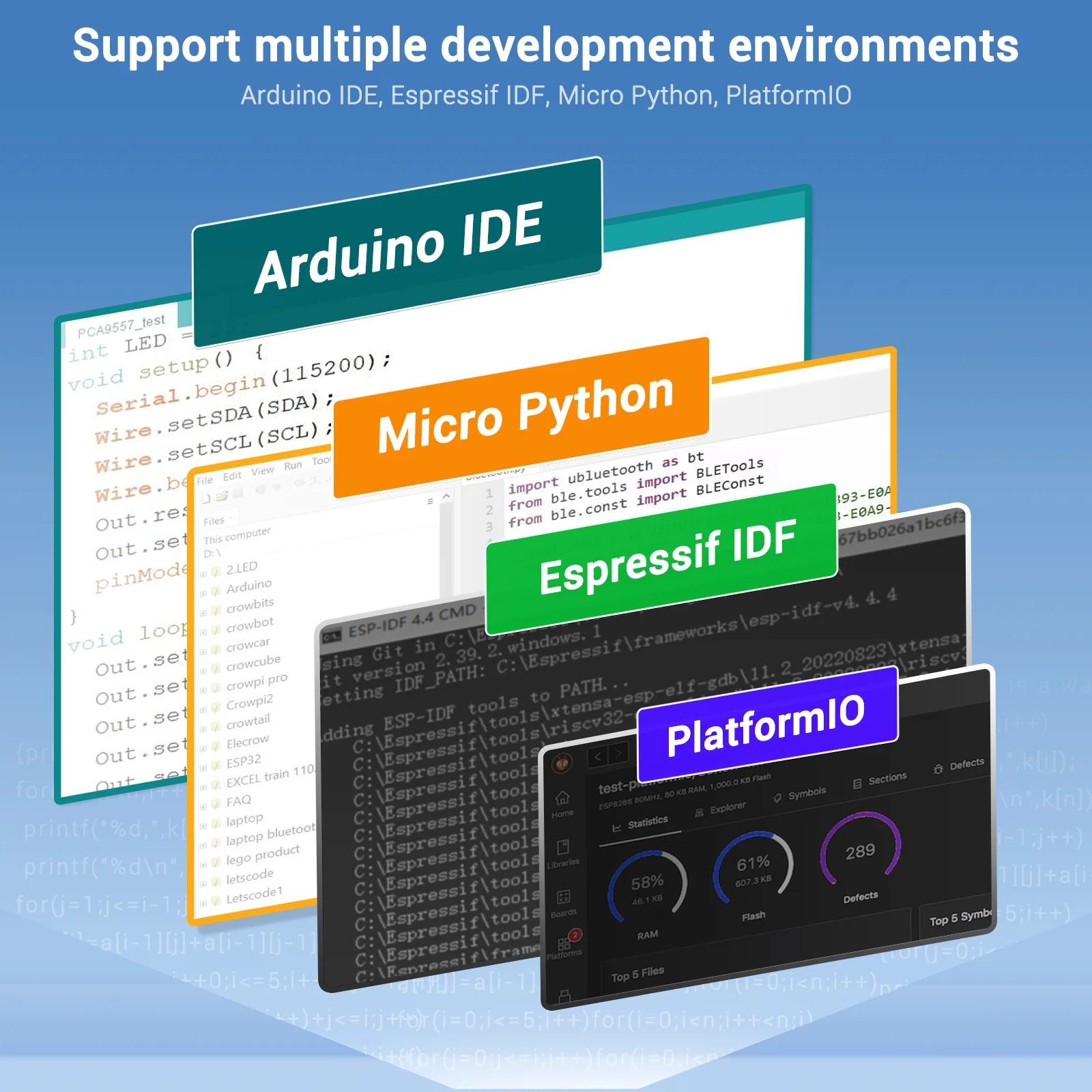 Podporuje řadu vývojových prostředí, jako jsou Arduino IDE, Espressif IDF, PlatformIO a Micro Python, aby vyhověl potřebám různých vývojářů a umožnil realizaci každého projektu.