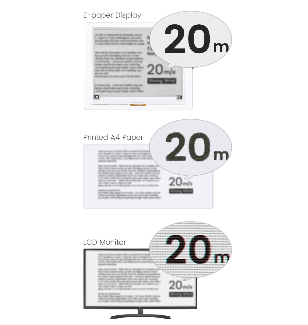 Displeje e-paper mohou jasně zobrazovat obrázky/text pod umělým nebo přirozeným osvětlením, bez podsvícení, s nižší spotřebou energie a delší životností díky částečnému obnovování. Protože jeho účinek je podobný jako u papíru, často se používá jako čtečka elektronických knih.