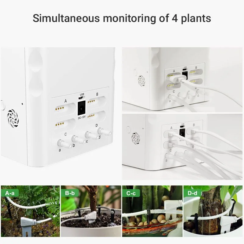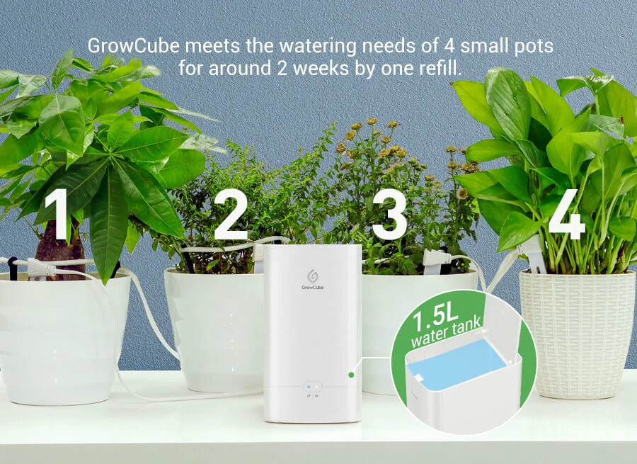 GrowCube může samostatně sledovat vlhkost půdy až 4 květináčů s různými rostlinami současně a podle toho regulovat výstup vody z každého výstupu, čímž umožňuje jemné řízení zavlažování každého květináče s rostlinami.