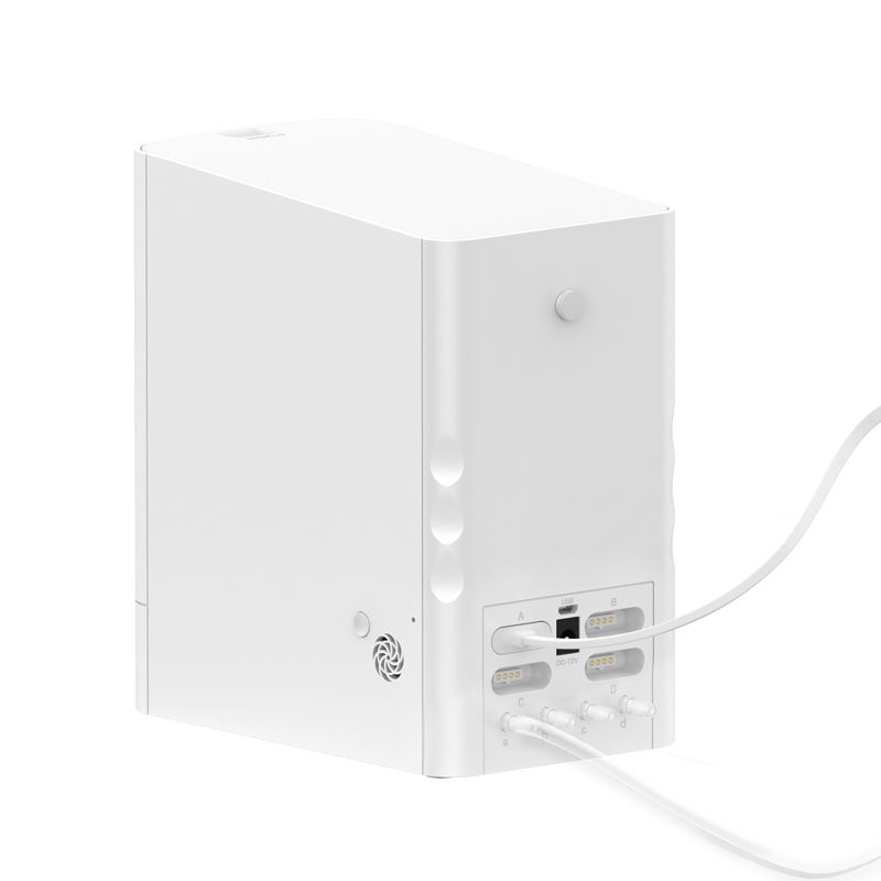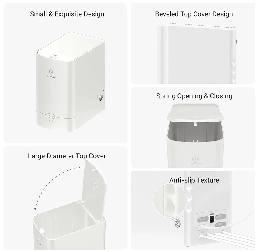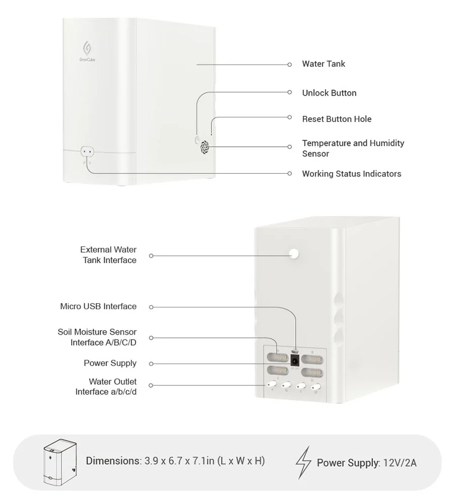 GrowCube je dodáván s 1,5l nádržkou na vodu, kterou můžete doplnit stisknutím horního krytu. Pokud máte různé rostliny nebo potřebujete odjet na delší dobu, GrowCube se díky jedinečnému vnějšímu přívodu vody na trupu může připojit k externím zdrojům vody, aby uspokojil větší potřebu vody.