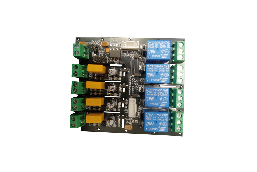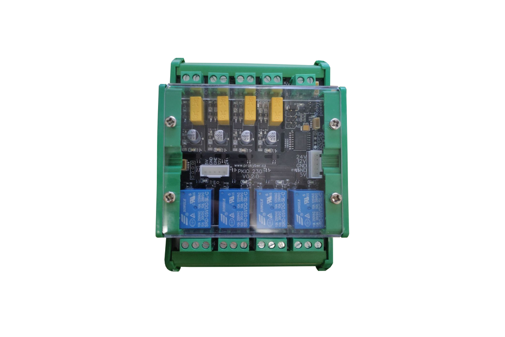 PKIO230 je deska s I2C ovládáním, 4 relé výstupy a 4 izolovanými 230V vstupy se snadným přiděláním na dráhy DIN. Adresy I2C jsou konfigurovatelné pro daisy-chain až 8 zařízení. Zařízení je připravené k použití s Home Assistant (dostupný příklad ESPHome) a Arduino frameworkem (dostupný příklad Platformio).